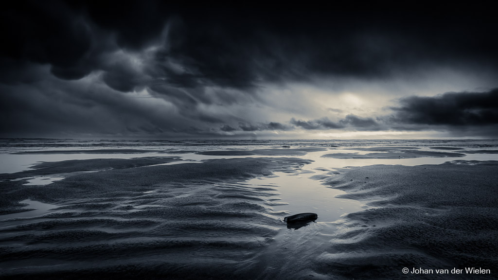 Ik dwaal over het strand van Schiermonnikoog onder lastige lichtomstandigheden. Gelukkig vind ik net op tijd een paar schelpen in een plasje water en met mijn ultra groothoek is een idee geboren.