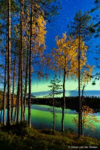 Het was een lange wens om zowel de gele berken als het groene noorderlicht in één foto te combineren. Dankzij de halfvolle maan die het landschap verlichtte, is het mij uiteindelijk gelukt.